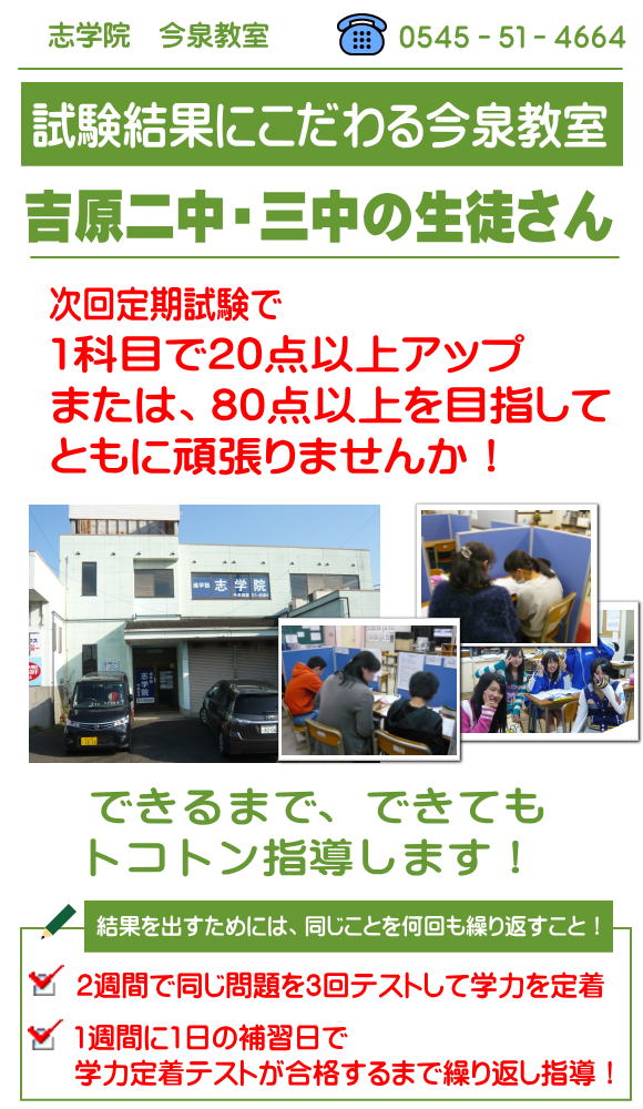 平成16年9月、開校しました。 学区は小学校が今泉小、中学は吉原二中ですが、吉原三中学区との境界線も近いことから三中生、またやや離れて東中生も通塾しています。そのため、塾はこの3校の中学生間の交流および情報交換の場にもなっています。
