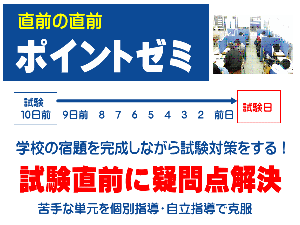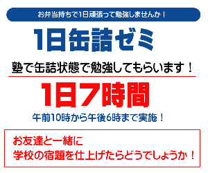家で一人で勉強する場合、テレビ等の誘惑が多いのでなかなか計画的に勉強できないと思います。そこで、試験直前の土曜日か日曜日のどちらか、午前10時から午後6時まで誘惑のない塾にきて缶詰状態で勉強してもらいます。