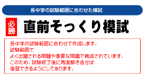 定期試験短期対策講座を受講した後、最後の仕上げとして「そっくり模試」を実施します。この模試では去年の定期試験問題を参考にでやすい問題・最低限理解しておきたい問題を選んで作成してあります。この模試を見直しするだけで成績がアップするようにしてあります。